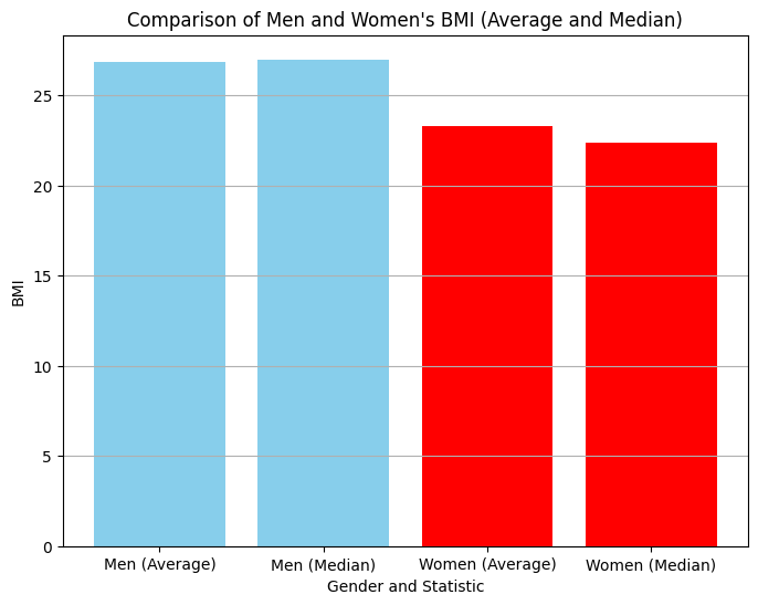 plt.title('Comparison of Men and Women\'s BMI (Average and Median)')